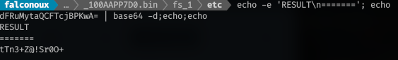 $ echo -e 'RESULT\n======='; echo dFRuMytaQCFTcjBPKwA= | base64 -d;echo;echo